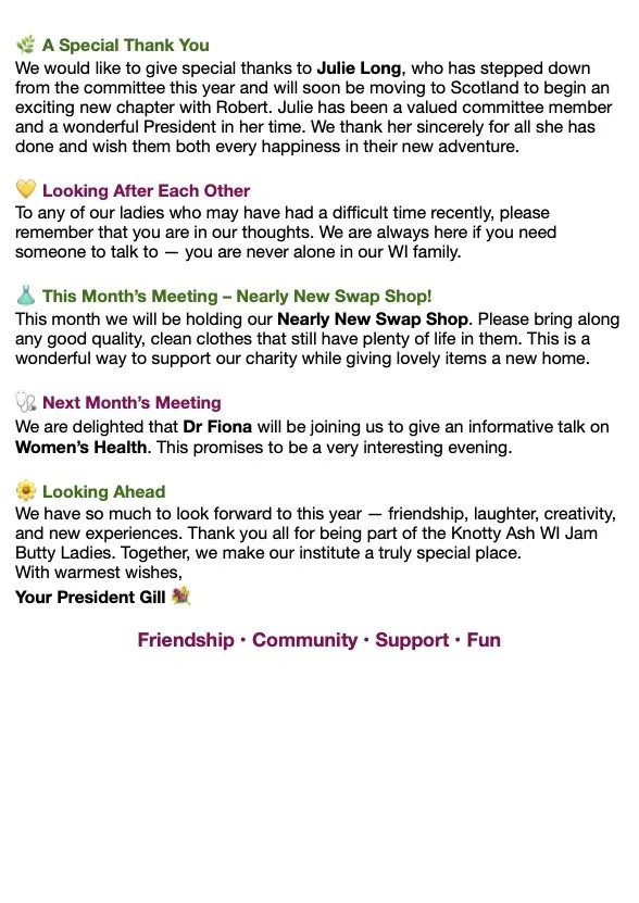 Knotty Ash WI The Jam Butty Ladies. We meet the Third Thursday each month Our next meeting 7:30pm Thursday 19th February 2026 Want to know more ?
