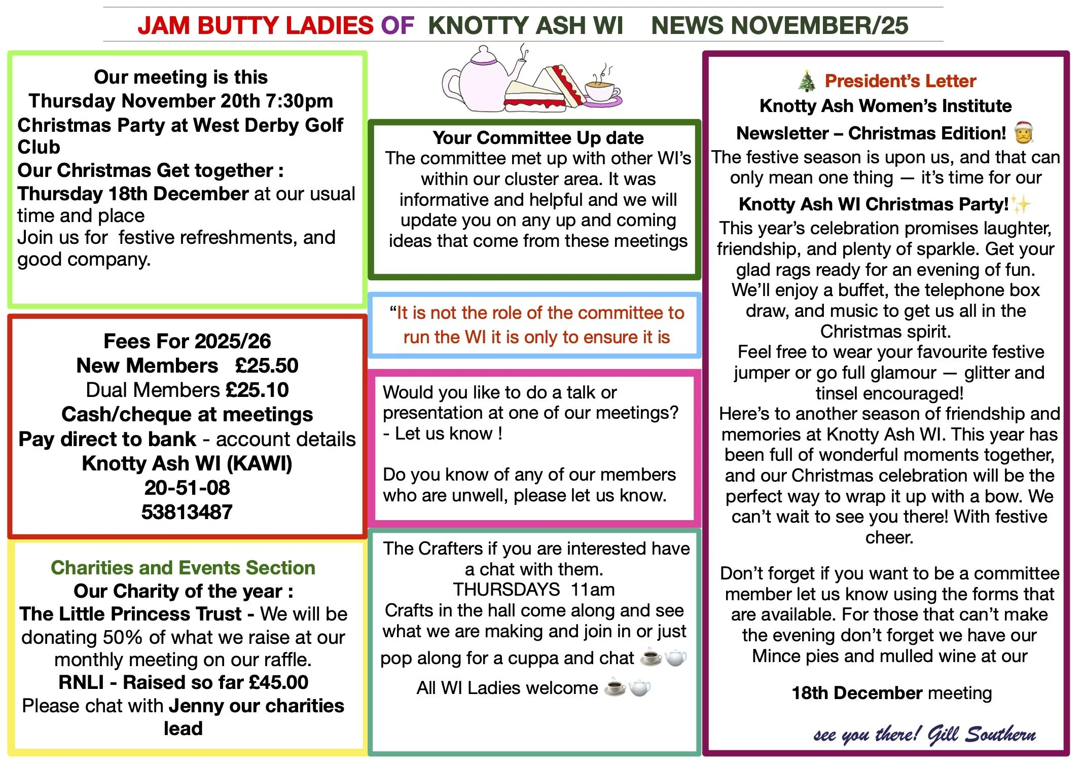 Knotty Ash WI The Jam Butty Ladies. We meet the Third Thursday each month Our next meeting Thursday 20h 7:30pm November 2025 Our Christmas Party at West Derby Golf Course (Ticketed event) Our Monthly News sheet Want to know more ?